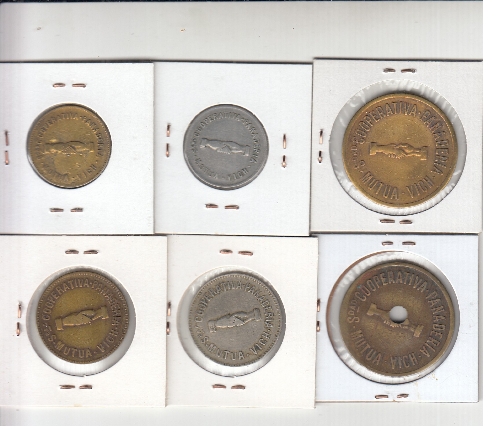 Lote123: VIC. ‘SOCIEDAD COOPERATIVA MUTUA PANADERÍA’. Monedas de 5 y 10 cts. y 1 pta. (con contramarca a la derecha), 2 pta. (con contramarca a la derecha) y 5 ptas. (una normal y otra con perforación central). Poco habituales. BC-MBC.
