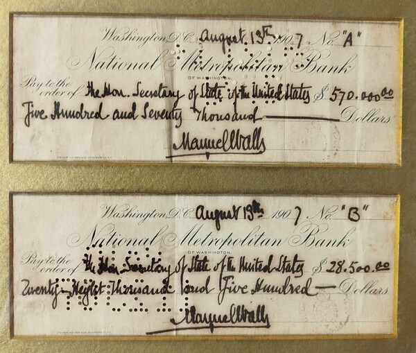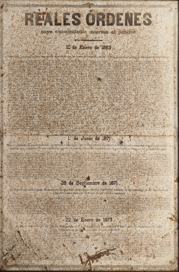 Lote 760: FERROCARRILES. Dos placas metálicas que forman un conjunto de 95 x 63 cm., en el que están impresas las REALES ORDENES de 10 de Enero de 1863, 1 de Junio de 1871, 28 de Septiembre de 1871 y 22 de Enero de 1878, todas con referencia al transporte de mercancías y de las normas a seguir. La real orden del 1 de Junio de 1871 nombra la Compañía de Ferrocarriles del Norte y la placa está impresa en SANTANDER. Enmarcadas en un cuadro con cristal ya que poseen deterioros propios de la antigüedad.