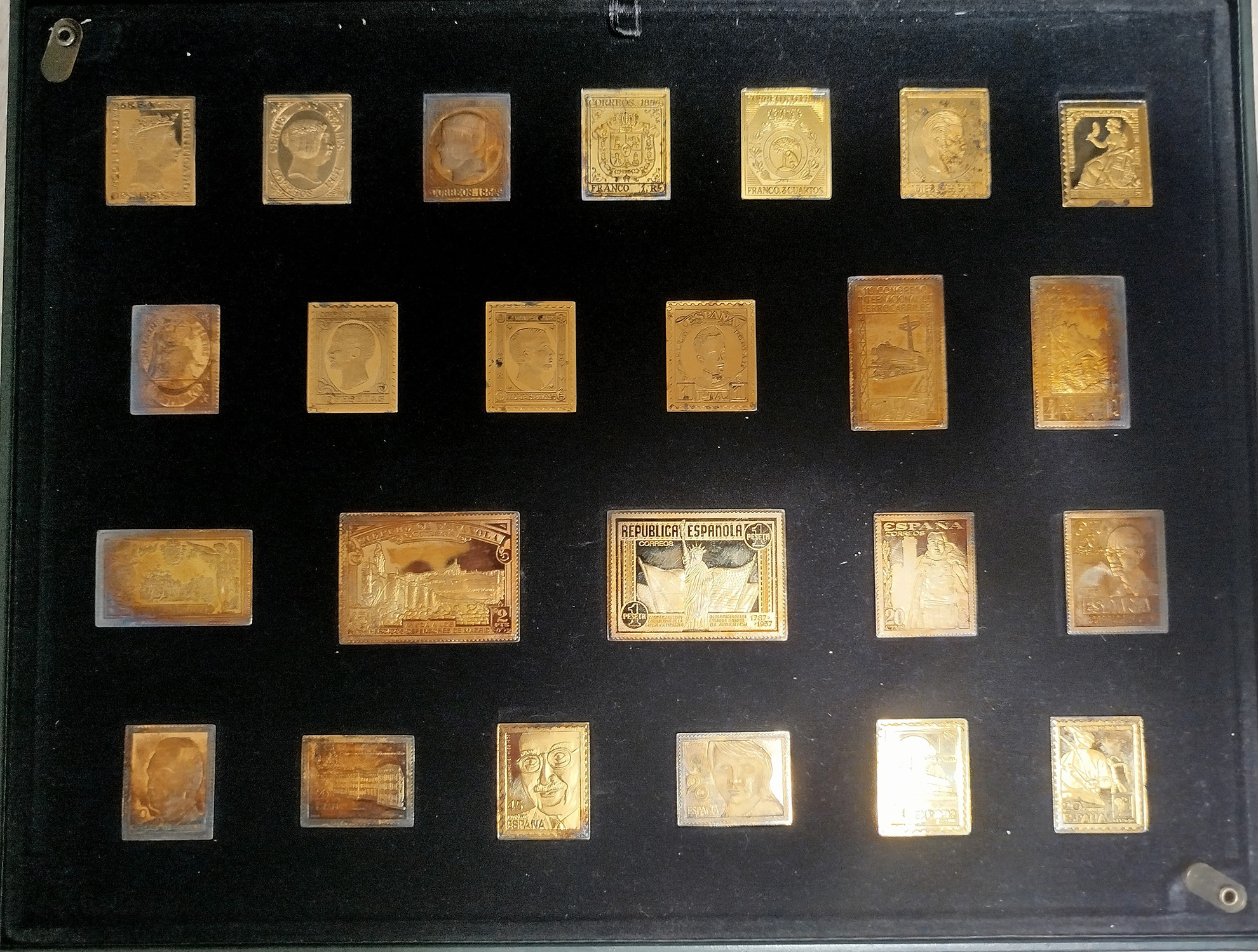 Lote 74: Colección de 24 Medallas de Plata bañadas en Oro, reproduciendo sellos de Correos, emitidos por Correos para conmemorar el 150 Aniv. del Sello, en estuche con Certificado. (Peso de las Medallas 330 grs.).