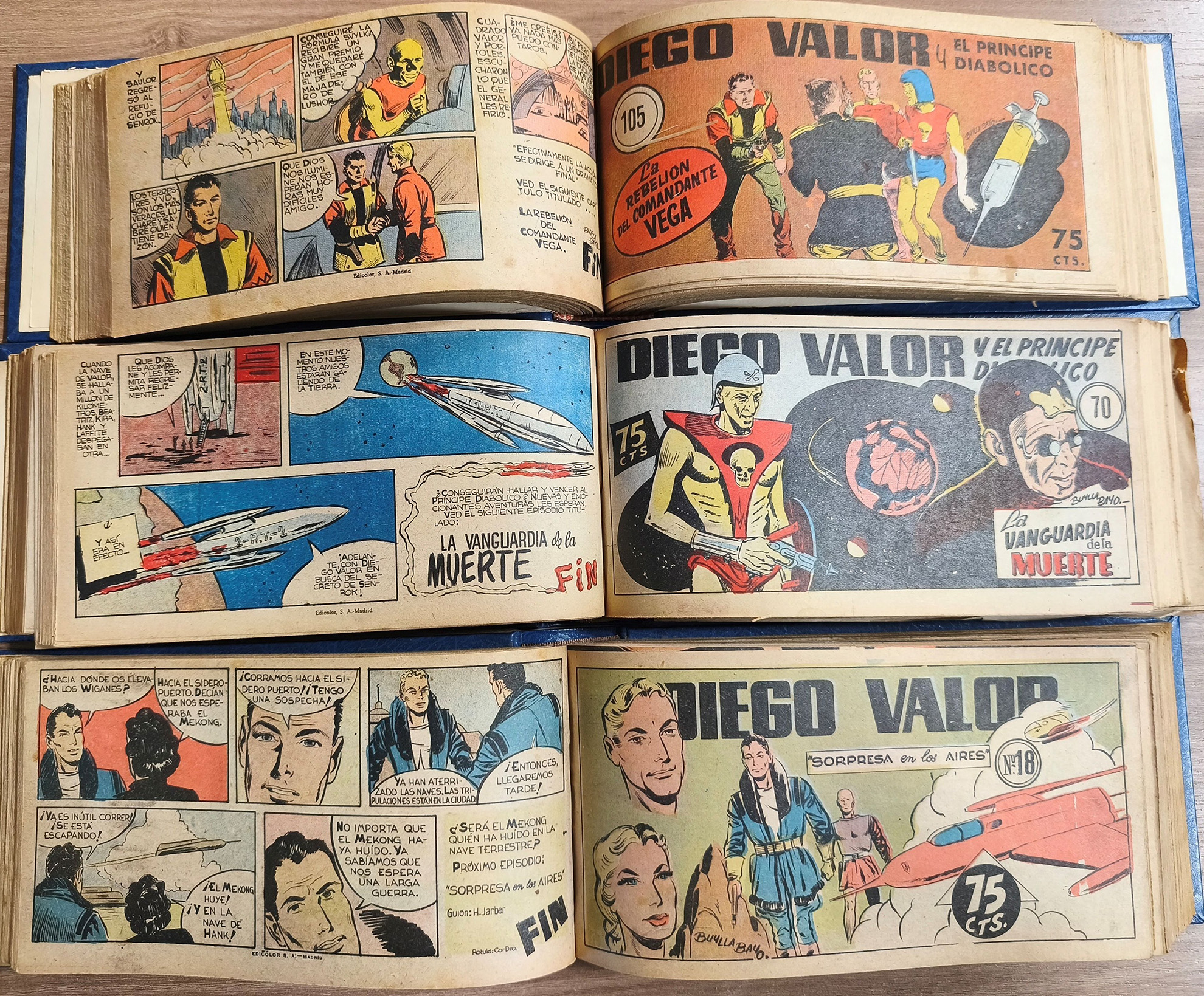 Lote 499: ‘DIEGO VALOR’. Colección completa de 124 cómics originales de EDICOLOR de 1954, encuadernados en tres tomos. Bastante buena conservación.